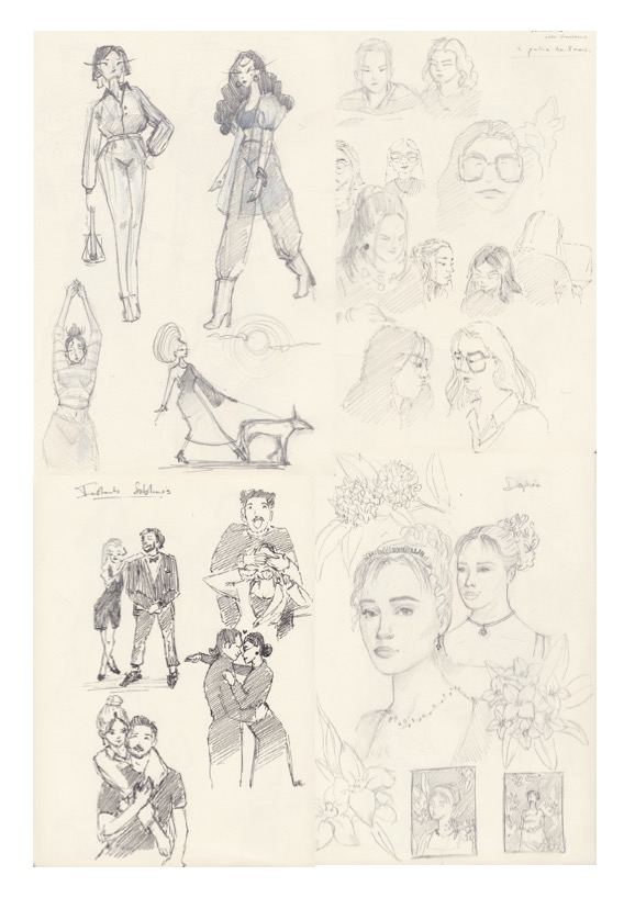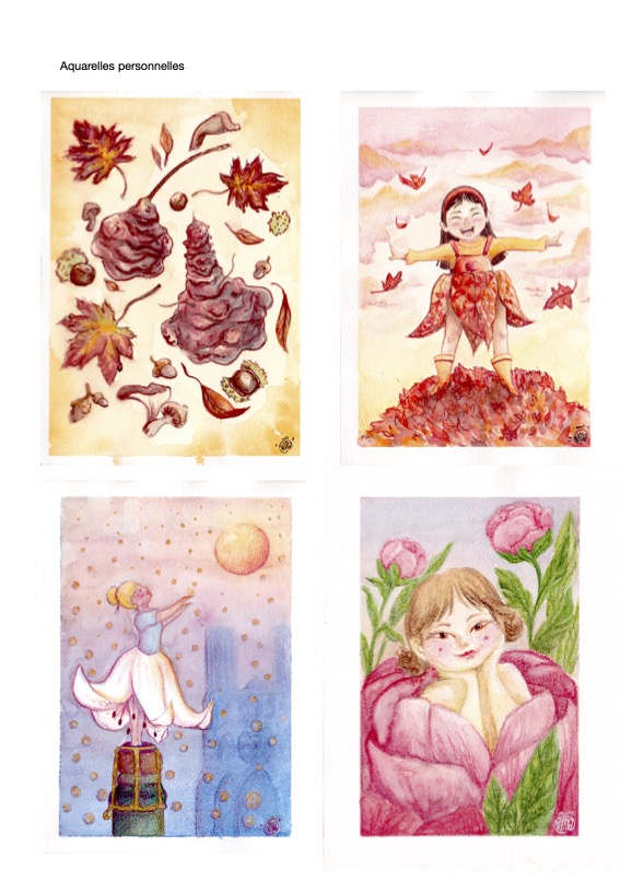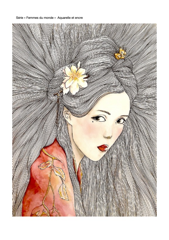 Croquis, encre, aquarelle ou illustration digitale : chaque technique me permet d’explorer une atmosphère différente. Mes images s’inspirent souvent des figures féminines, de l’enfance, de la nature et des liens qui nous relient.